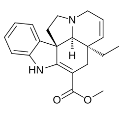 Tabersonine is a terpene indole alkaloid found in the medicinal plant Catharanthus roseus and also plants in the genus Voacanga[1]: 8 (both taxa belonging to the alkaloid-rich family Apocynaceae). Tabersonine is hydroxylated at the 16 position by the enzyme tabersonine 16-hydroxylase (T16H) to form 16-hydroxytabersonine.[2] The enzyme leading to its formation is currently unknown. Tabersonine is the first intermediate leading to the formation of vindoline one of the two precursors required for vinblastine biosynthesis.
