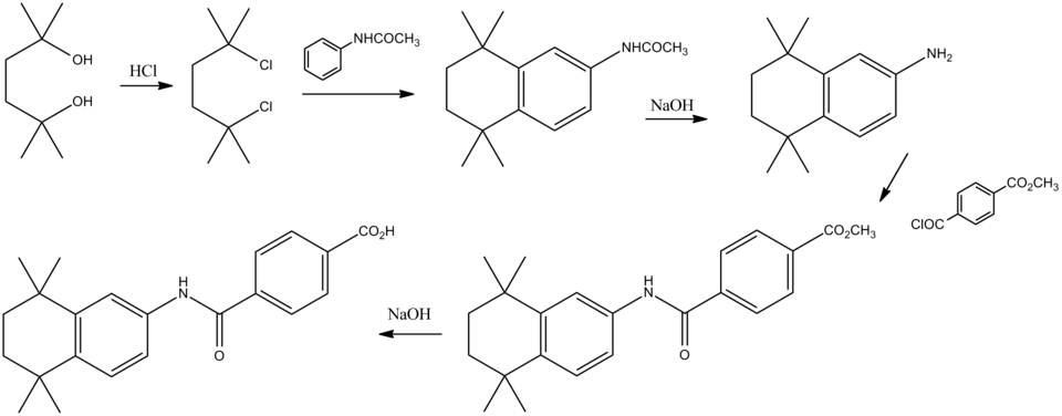 Reaction of the diol (1) with hydrogen chloride affords the corresponding dichloro derivative (2). Aluminum chloride mediated Friedel–Crafts alkylation of acetanilide with the dichloride affords the tetralin (3). Basic hydrolysis leads to the primary amine (4). Acylation of the primary amino group with the half acid chloride half ester from terephthalic acid (5) leads to the amide (6). Basic hydrolysis of the ester grouping then affords (7).[7]