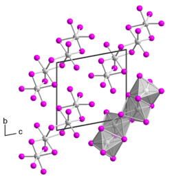 Tantalum(IV) iodide is a black solid. It has a crystal structure isotypic to that of niobium(IV) iodide.[4] Single-crystalline tantalum(IV) iodide was first obtained in 2008 by Rafal Wiglusz and Gerd Meyer as a chance product of a reaction in a tantalum ampoule that was supposed to lead to the product Rb(Pr6C2)I12.[5] The single crystal has a triclinic crystal structure with space group P1 (space group no. 2) with two formula units per unit cell (a = 707.36 pm, b = 1064.64 pm, c = 1074.99 pm, α = 100.440°, β = 89.824° and γ = 104.392°). The crystal structure differs from that of other transition metal tetraiodides, which usually have a MI4/2I2/1 chain structure, as it consists of TaI6 octahedra bridged over a common surface to form a dimer. Two such dimers bridge over a common edge to form a tetramer.[6]