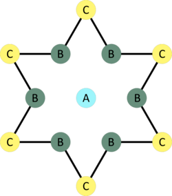 In the 1T phase, selenium atoms show an octahedral symmetry[5] and the relative orientation of the selenium atoms in the topmost and bottommost layers is opposed. On a macroscopic scale, the sample shows a gold colour.[4] The lattice parameters are a = b = 3.48 Å,[5] while c = 0.627 nm.[4] Depending on the temperature, it shows different types of charge density waves (CDW): an incommensurate CDW (ICDW) between 473 and 600 K (200–327 °C)[4] and a commensurate CDW (CCDW) below 473 K (200 °C).[4] In the commensurate CDW, the resulting superlattice shows a √13 × √13 reconstruction[6] often referred to as star of David (SOD),[6] with respect to the lattice parameter (a = b) of non distorted TaSe2 (above 600 K (327 °C)). Film thickness can influence as well the CDW transition temperature: the thinner the film, the lower the transition temperature from ICDW to CCDW.[4]