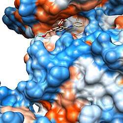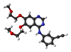 Erlotinib is an epidermal growth factor receptor inhibitor (EGFR inhibitor). The drug follows Iressa (gefitinib), which was the first drug of this type. Erlotinib specifically targets the epidermal growth factor receptor (EGFR) tyrosine kinase, which is highly expressed and occasionally mutated in various forms of cancer. It binds in a reversible fashion to the adenosine triphosphate (ATP) binding site of the receptor.[26] For the signal to be transmitted, two EGFR molecules need to come together to form a homodimer. These then use the molecule of ATP to trans-phosphorylate each other on tyrosine residues, which generates phosphotyrosine residues, recruiting the phosphotyrosine-binding proteins to EGFR to assemble protein complexes that transduce signal cascades to the nucleus or activate other cellular biochemical processes. When erlotinib binds to EGFR, formation of phosphotyrosine residues in EGFR is not possible and the signal cascades are not initiated.