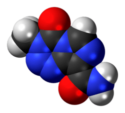 Temozolomide is an imidazotetrazine derivative.[21] It is slightly soluble in water and aqueous acids,[22] and decomposes at 212 °C (414 °F).[23] It was discovered in 2021 that temozolomide is an explosive, tentatively assigned as UN Class 1.[24][25]
