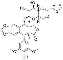 Teniposide is a semisynthetic derivative of podophyllotoxin[2] from the rhizome of the wild mandrake (Podophyllum peltatum). More specifically, it is a glycoside of podophyllotoxin with a D-glucose derivative. It is chemically similar to the anti-cancer drug etoposide, being distinguished only by a thienyl rest where etoposide has a methyl.[4] Both these compounds have been developed with the aim of creating less toxic derivatives of podophyllotoxin.[6]
