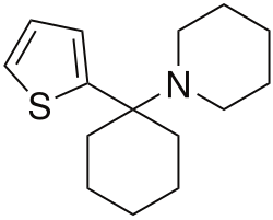 Tenocyclidine (TCP) is a dissociative anesthetic with psychostimulant effects. It was discovered by a team at Parke-Davis in the late 1950s.[2] It is similar in effects to phencyclidine (PCP) but is considerably more potent. TCP has slightly different binding properties to PCP, with more affinity for the NMDA receptors,[3] but less affinity for the sigma receptors.[4] Because of its high affinity for the PCP site of the NMDA receptor complex, the 3H radiolabelled form of TCP is widely used in research into NMDA receptors.