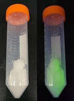 ![]() Hydrate form of terbium nitrate (left) and luminescence under 254 nm UV light (right)