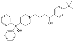 Terfenadine is an antihistamine formerly used for the treatment of allergic conditions. It was brought to market by Hoechst Marion Roussel (now Sanofi) and was marketed under various brand names, including Seldane in the United States, Triludan in the United Kingdom, and Teldane in Australia.[1] It was superseded by fexofenadine in the 1990s due to the risk of a particular type of disruption of the electrical rhythms of the heart (specifically cardiac arrhythmia caused by QT interval prolongation) and has been withdrawn from most of markets worldwide.[2]: 53