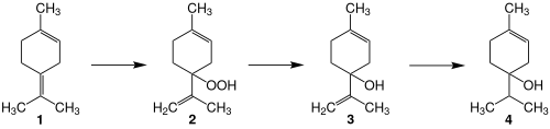 Terpinen-4-ol can be synthesized from terpinolene (1) via photooxygenation, reduction of the resulting hydroperoxide (2), and selective hydrogenation of the terminal double bond in 3.[5]