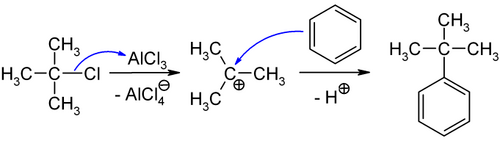 tert-Butylbenzene can be produced by the treatment of benzene with isobutene[1] or by the reaction of benzene with tert-butyl chloride in presence of anhydrous aluminium chloride,[2] the latter is depicted below: