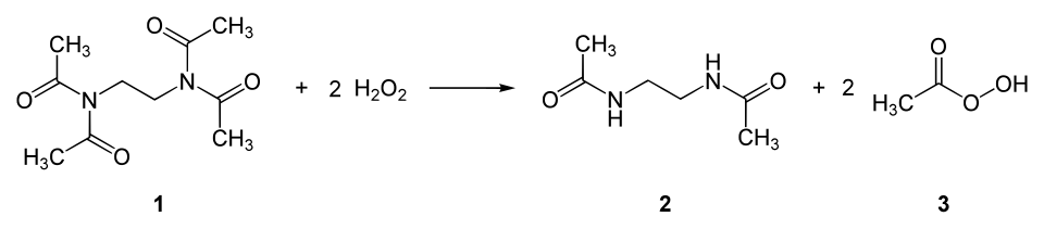 TAED reacts with alkaline peroxide via the process called perhydrolysis releasing of peracetic acid. The first perhydrolysis gives triacetylethylenediamine (TriAED) and the second gives diacetylethylenediamine (DAED):[3]