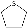 Tetrahydrothiophene is an organosulfur compound with the formula (CH2)4S. The molecule consists of a five-membered saturated ring with four methylene groups and a sulfur atom. It is the saturated analog of thiophene and is therefore the sulfur analog of THF. It is a volatile, colorless liquid with an intensely unpleasant odor. It is also known as thiophane, thiolane, or THT.