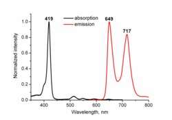 Tetraphenylporphyrin has a strong absorption band with maximum at 419 nm (so called Soret band) and four weak bands with maxima at 515, 550, 593 and 649 nm (so called Q-bands). It shows red fluorescence with maxima at 649 and 717 nm. The quantum yield is 11%.[11] Soret red shifts for Zn(TTP)-Donor systems relative to the Soret band at 416.2 nm for Zn(TTP) in cyclohexane have been measured.[9]