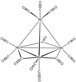 According to X-ray crystallography, Rh4(CO)12 features a tetrahedral array of four Rh atoms with nine terminal CO ligands and three bridging CO ligands. The structure can be expressed as Rh4(CO)9(μ-CO)3.[1]