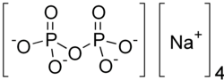 Tetrasodium pyrophosphate, also called sodium pyrophosphate, tetrasodium phosphate or TSPP, is an inorganic compound with the formula Na4P2O7. As a salt, it is a white, water-soluble solid. It is composed of pyrophosphate anion and sodium ions. Its toxicity is approximately twice that of table salt when ingested orally.[3] Also known is the decahydrate Na4P2O7 · 10(H2O).[4]