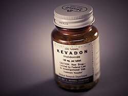 Canada's Food and Drug Directorate approved the sale of thalidomide by prescription in November 1960.[60] There were many different forms sold: Kevadon, produced by the William S. Merrell Company seeking approval for its thalidomide product, was released on the market in April 1961, and the most common variant (Horner's Talimol) was put on the market on October 23 of the same year.[61] Two months after Talimol went on sale, pharmaceutical companies sent physicians letters warning about the risk of birth defects.[61] It was not until March 1962 that both drugs were banned from the Canadian market by the directorate, and soon afterward physicians were warned to destroy their supplies.[61]