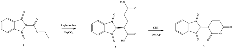Celgene Corporation originally synthesized thalidomide using a three-step sequence starting with L-glutamic acid treatment, but this has since been reformed by the use of L-glutamine.[38] As shown in the image below, N-carbethoxyphthalimide (1) can react with L-glutamine to yield N-phthaloyl-L-glutamine (2). Cyclization of N-phthaloyl-L-glutamine occurs using carbonyldiimidazole, which then yields thalidomide (3).[38] Celgene Corporation's original method resulted in a 31% yield of S-thalidomide, whereas the two-step synthesis yields 85–93% product that is 99% pure.