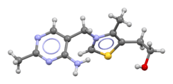 • cation: InChI=1S/C12H17N4OS/c1-8-11(3-4-17)18-7-16(8)6-10-5-14-9(2)15-12(10)13/h5,7,17H,3-4,6H2,1-2H3,(H2,13,14,15)/q+1 checkY