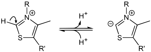 The part of TPP molecule that is most commonly involved in reactions is the thiazole ring, which contains nitrogen and sulfur. Thus, the thiazole ring is the "reagent portion" of the molecule. The C2 of this ring is capable of acting as an acid by donating its proton and forming a carbanion.[7] Normally, reactions that form carbanions are highly unfavorable, but the positive charge on the tetravalent nitrogen just adjacent to the carbanion stabilizes the negative charge, making the reaction much more favorable.[7] A compound with positive and negative charges on adjacent atoms is called an ylide, so sometimes the carbanion form of TPP is referred to as the "ylide form".[5][8]