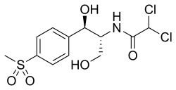 Thiamphenicol (also known as thiophenicol and dextrosulphenidol) is an antibiotic.[1] It is the methyl-sulfonyl analogue of chloramphenicol and has a similar spectrum of activity, but is 2.5 to 5 times as potent. Like chloramphenicol, it is insoluble in water, but highly soluble in lipids. It is used in many countries as a veterinary antibiotic, but is available in China, Taiwan, Brazil, Morocco, and Italy for use in humans. Its main advantage over chloramphenicol is that it has never been associated with aplastic anaemia.[2]