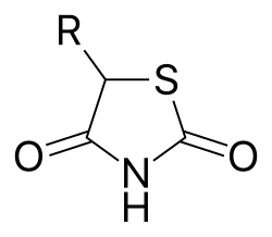The thiazolidinediones /θ.əˌzlɪdnˈd.n/, abbreviated as TZD, also known as glitazones after the prototypical drug ciglitazone,[1] are a class of heterocyclic compounds consisting of a five-membered C3NS ring. The term usually refers to a family of drugs used in the treatment of diabetes mellitus type 2 that were introduced in the late 1990s. As of 2024, there are two FDA-approved drugs in this class, pioglitazone and rosiglitazone.[2]