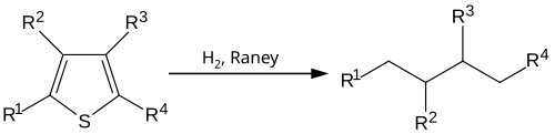 Desulfurization of thiophene with Raney nickel affords butane. When coupled with the easy 2,5-difunctionalization of thiophene, desulfurization provides a route to 1,4-disubstituted butanes.[20]