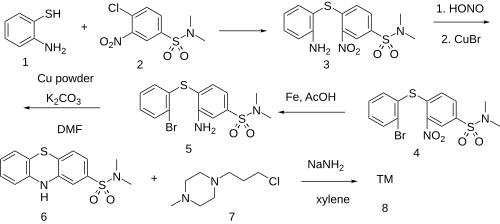 Thioether formation between 2-Aminothiophenol (1) and 4-Chloro-N,N-Dimethyl-3-Nitrobenzenesulfonamide [137-47-3] (2) gives 4-(2-aminophenyl)sulfanyl-N,N-dimethyl-3-nitrobenzenesulfonamide [5510-56-5] (3). Sandmeyer reaction with cuprous bromide [7787-70-4] gave 4-[(2-Bromophenyl)-thio]-N,N'-dimethyl-3-nitro-benzenesulfonamide [5510-58-7] (4). Bechamp reduction gave 3-Amino-4-((2-bromophenyl)thio)-N,N-dimethylbenzenesulphonamide [5592-64-3] (5). Goldberg reaction completed the formation of the phenothiazine ring and gave N,N-dimethyl-10H-phenothiazine-2-sulfonamide [1090-78-4] (6). Attachment of the sidechain by sodamide reaction with 1-(3-Chloropropyl)-4-Methylpiperazine [104-16-5] (7) completes the synthesis of Thioproperazine (8), respectively.
