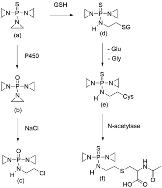 In phase 2 thiotepa is detoxified via the conjugation with glutathione by glutathione S-transferase.[9][23] This is followed by the removal of the glutamyl and glycine moieties, and concludes with the N-acetylation of the cysteine conjugate by N-acetylase to form thiotepa-mercapturate. This derivative is more water-soluble, facilitating urinary excretion.[23] Tepa is not conjugated to glutathione but reacts further in the urine and plasma to monochloro tepa. The conversion to a β-chloroethyl moiety depends on the pH and the chloride concentration. The formation of monochloride tepa mainly occurs in the urine.[24]