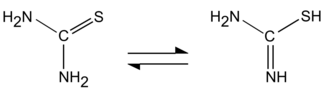 Thiourea occurs in two tautomeric forms, of which the thione form predominates in aqueous solutions. The equilibrium constant has been calculated as Keq is 1.04×10−3.[5] The thiol form, which is also known as an isothiourea, can be encountered in substituted compounds such as isothiouronium salts.