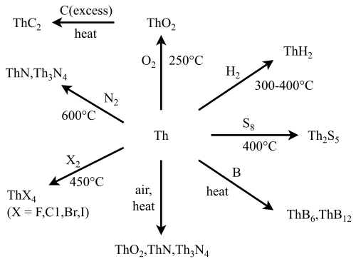 Thorium reacts with hydrogen to form the thorium hydrides ThH2 and Th4H15, the latter of which is superconducting below the transition temperature of 7.5–8 K; at standard temperature and pressure, it conducts electricity like a metal.[12] Thorium is the only metallic element that readily forms a hydride higher than MH3.[31] Finely divided thorium metal reacts very readily with hydrogen at standard conditions, but large pieces may need to be heated to 300–400 °C for a reaction to take place.[12] Around 850 °C, the reaction forming first ThH2 and then Th4H15 occurs without breaking up the structure of the thorium metal.[12] Thorium hydrides react readily with oxygen or steam to form thoria, and at 250–350 °C quickly react with hydrogen halides, sulfides, phosphides, and nitrides to form the corresponding thorium binary compounds.[12]