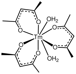 Thulium acetylacetonate is a coordination compound with the formula Tm(C5H7O2)3. This anhydrous acetylacetonate complex is often discussed but unlikely to exist per se. The 8-coordinated dihydrate Tm(C5H7O2)3(H2O)2 is a more plausible formula based on the behavior of other lanthanide acetylacetonates. The dihydrate has been characterized by X-ray crystallography.[3][4] Upon attempted dehydration by heating under vacuum, other hydrated lanthanide tris(acetylacetonate) complexes decompose to give oxo-clusters.[5]