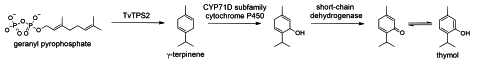 A predicted method of biosynthesis of thymol in thyme and oregano begins with the cyclization of geranyl diphosphate by TvTPS2 to γ-terpinene. Oxidation by a cytochrome P450 in the CYP71D subfamily creates a dienol intermediate, which is then converted into a ketone by short-chain dehydrogenase. Lastly, keto-enol tautomerization gives thymol. Its dissociation constant (pKa) is 10.59±0.10.[8] Thymol absorbs maximum UV radiation at 274 nm.[9]