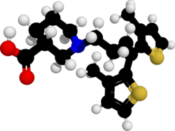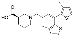 - ^ a b Andersen KE, Braestrup C, Grønwald FC, Jørgensen AS, Nielsen EB, Sonnewald U, et al. (June 1993). "The synthesis of novel GABA uptake inhibitors. 1. Elucidation of the structure-activity studies leading to the choice of (R)-1-[4,4-bis(3-methyl-2-thienyl)-3-butenyl]-3-piperidinecarboxylic acid (tiagabine) as an anticonvulsant drug candidate". Journal of Medicinal Chemistry. 36 (12): 1716–1725. doi:10.1021/jm00064a005. PMID 8510100.