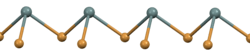 In the gas phase SnBr2 is non-linear with a bent configuration similar to SnCl2 in the gas phase. The Br-Sn-Br angle is 95° and the Sn-Br bond length is 255pm.[4] There is evidence of dimerisation in the gaseous phase.[5] The solid state structure is related to that of SnCl2 and PbCl2 and the tin atoms have five near bromine atom neighbours in an approximately trigonal bipyramidal configuration.[6] Two polymorphs exist: a room-temperature orthorhombic polymorph, and a high-temperature hexagonal polymorph. Both contain (SnBr2)∞ chains but the packing arrangement differs.[1]