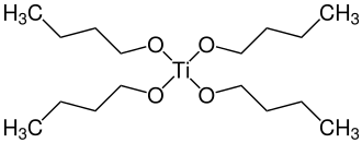 Titanium butoxide is a metal alkoxide with the formula Ti(OBu)4 (Bu = –CH2CH2CH2CH3). It is a colorless odorless liquid although aged samples can appear yellowish. Owing to hydrolysis, samples have a weak alcohol-like odor. It is soluble in many organic solvents.[1][3] Decomposition in water is not hazardous, and therefore titanium butoxide is often used as a liquid source of titanium dioxide, which allows deposition of TiO2 coatings of various shapes and sizes down to the nanoscale.[4][5]