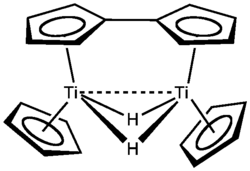 - ^ a b Troyanov, Sergei I.; Antropiusová, Helena; Mach, Karel (1992). "Direct proof of the molecular structure of dimeric titanocene; The X-ray structure of μ(η5:η5-fulvalene)-di-(μ-hydrido)-bis(η5-cyclopentadienyltitanium)·1.5 benzene". J. Organomet. Chem. 427 (1): 49–55. doi:10.1016/0022-328X(92)83204-U.