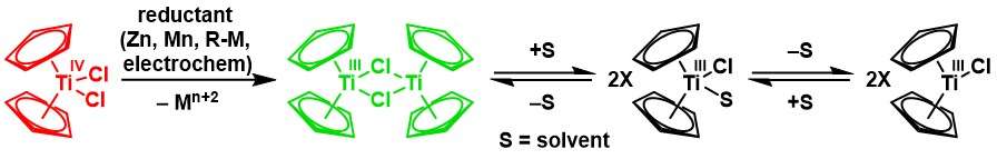 Reduction with zinc gives the dimer of bis(cyclopentadienyl)titanium(III) chloride in a solvent-mediated chemical equilibrium:[21][22]