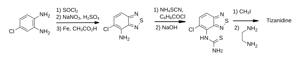Tizanidine is a derivative of 2,1,3-benzothiadiazole and its first published synthesis was reported in a patent.[17] The 5-chloro-2,1,3-benzothiadiazol-4-amine intermediate was a known compound, produced in three steps from 4-chlorophenylenediamine as shown.[18] Treatment with two equivalents of thionyl chloride in pyridine formed the heterocycle, which was nitrated with sodium nitrate in sulfuric acid and reduced using iron and acetic acid.
