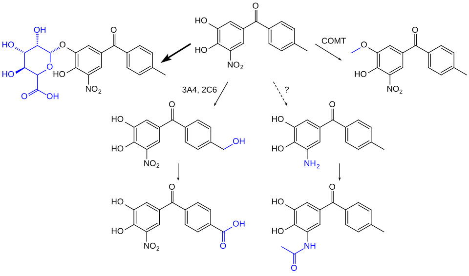 - ^ Jorga K, Fotteler B, Heizmann P, Gasser R (October 1999). "Metabolism and excretion of tolcapone, a novel inhibitor of catechol-O-methyltransferase". British Journal of Clinical Pharmacology. 48 (4): 513–20. doi:10.1046/j.1365-2125.1999.00036.x. PMC 2014389. PMID 10583021.