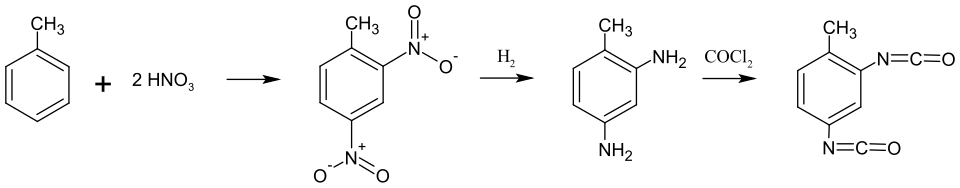 2,4-TDI is prepared in three steps from toluene via dinitrotoluene and 2,4-diaminotoluene (TDA). Finally, the TDA is subjected to phosgenation, i.e., treatment with phosgene to form TDI. This final step produces HCl as a byproduct and is a major source of industrial hydrochloric acid.[4]