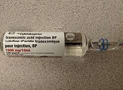 Tranexamic acid is a medication used to treat or prevent excessive blood loss from major trauma, postpartum bleeding, surgery, tooth removal, nosebleeds, and heavy menstruation.[7][8] It is also used for hereditary angioedema.[7][3] It is taken either by mouth, injection into a vein,[7] or by intramuscular injection.