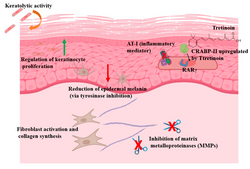 For its use in acne, tretinoin (along with other retinoids) are vitamin A derivatives that act by binding to two nuclear receptor families within keratinocytes: the retinoic acid receptors (RAR) and the retinoid X receptors (RXR).[21] These events contribute to the normalization of follicular keratinization and decreased cohesiveness of keratinocytes, resulting in reduced follicular occlusion and microcomedone formation.[39] The retinoid-receptor complex competes for coactivator proteins of AP-1, a key transcription factor involved in inflammation.[21] Retinoids also down-regulate expression of toll-like receptor (TLR)-2, which has been implicated in the inflammatory response in acne.[40] Moreover, tretinoin and retinoids may enhance the penetration of other topical acne medications.[20]