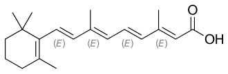 The origin of the name tretinoin is uncertain,[49][50] although several sources agree (one with probability,[49] one with asserted certainty[51]) that it probably comes from trans- + retinoic [acid] + -in, which is plausible given that tretinoin is the all-trans isomer of retinoic acid. The name isotretinoin is the same root tretinoin plus the prefix iso-. Regarding pronunciation, the following variants apply equally to both tretinoin and isotretinoin. Given that retinoic is pronounced /ˌrɛtɪˈnoʊɪk/,[50][51][49][52] it is natural that /ˌtrɛtɪˈnoʊɪn/ is a commonly heard pronunciation. Dictionary transcriptions also include /ˌtrɪˈtɪnoʊɪn/ (tri-TIN-oh-in)[50][49] and /ˈtrɛtɪnɔɪn/.[51][52]