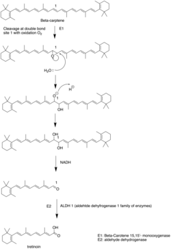 All-trans retinoic acid is produced by the body from dietary factors including retinol, retinyl esters or beta-carotene. The beta-carotene is first cleaved by beta-carotene 15-15'-monooxygenase to retinol which is subsequently oxidized by RDH and ALDH enzymes to produce all-trans retinoic acid (see retinoic acid). Tretinoin is produced synthetically using standard industrial practices.[41]