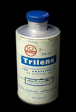 Trichloroethylene is a good analgesic at 0.35 to 0.5% concentrations.[22] Trichloroethylene was used in the treatment of trigeminal neuralgia beginning in 1916.[23] Trichloroethylene for use as an analgesic for neuralgia were sold under the trade names "Gemalgene", "Trethylene" and "Chlorylen".