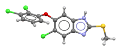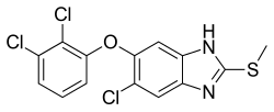 It is a member of the benzimidazole family of anthelmintics. The benzimidazole drugs share a common molecular structure, triclabendazole being the exception in having a chlorinated benzene ring but no carbamate group. Benzimidazoles such as triclabendazole are generally accepted to bind to beta-tubulin therefore preventing the polymerization of microtubules.[7]