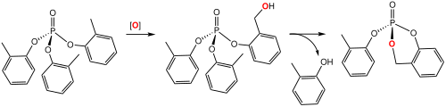 The first step results in a saligenin cyclic o-tolyl phosphate (SCOTP) intermediate, an enzyme inhibitor.[9] To the right, the first step of TOCP metabolism is depicted by means of chemical structures. This intermediate is able to inhibit neuropathy target esterase (NTE) and results in the classic organophosphate-induced delayed neuropathy (OPIDN). In tandem, TOCP exerts physical damage by causing axonal destruction and myelin disintegration within specialized cells that transmit nerve impulses (neurons).[10]