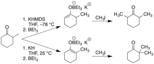 2 and triethylborane generates the less substituted (and less stable) enolate. After reaction with methyl iodide the former mixture gives 2,2-dimethylcyclohexanone in 90% yield while the latter produces 2,6-dimethylcyclohexanone in 93% yield.[8][9] The Et stands for ethyl group CH3CH2−.