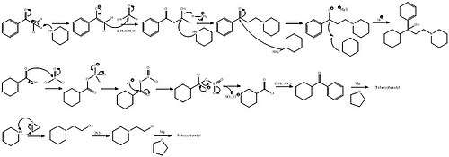 In the first way, the initial 2-(1-piperidino)propiophenone is synthesized in turn by the aminomethylation of acetophenone using paraformaldehyde and piperidine in a Mannich reaction. In the second step the 2-(1-piperidino)propiophenone is reacted with cyclohexylmagnesium bromide in a Grignard reaction.[26]