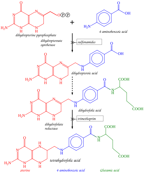 Trimethoprim binds to dihydrofolate reductase and inhibits the reduction of dihydrofolic acid (DHF) to tetrahydrofolic acid (THF).[24] THF is an essential precursor in the thymidine synthesis pathway and interference with this pathway inhibits bacterial DNA synthesis.[24] Trimethoprim's inhibitory activity for bacterial dihydrofolate reductase is sixty thousand times greater than for human dihydrofolate reductase.[25] Sulfamethoxazole inhibits dihydropteroate synthase, an enzyme involved further upstream in the same pathway.[24] Trimethoprim and sulfamethoxazole are commonly used in combination due to possible synergistic effects, and reduced development of resistance.[24] This benefit has been questioned.[26]