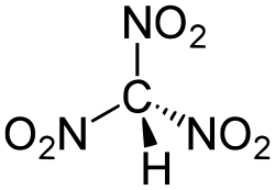 Trinitromethane, also referred to as nitroform, is a nitroalkane and oxidizer with chemical formula HC(NO2)3. It was first obtained in 1857 as the ammonium salt by the Russian chemist Leon Nikolaevich Shishkov (1830–1908).[2][3] In 1900, it was discovered that nitroform can be produced by the reaction of acetylene with anhydrous nitric acid.[4] This method went on to become the industrial process of choice during the 20th century. In the laboratory, nitroform can also be produced by hydrolysis of tetranitromethane under mild basic conditions.[5]