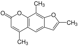 Trioxsalen (trimethylpsoralen (TMP), trioxysalen (INN) or Trisoralen) is a furanocoumarin and a psoralen derivative. It is obtained from several plants, mainly Psoralea corylifolia. Like other psoralens it causes photosensitization of the skin. It is administered either topically or orally in conjunction with UV-A (the least damaging form of ultraviolet light) for phototherapy treatment of vitiligo[1] and hand eczema.[2] After photoactivation it creates interstrand cross-links in DNA, which can cause programmed cell death unless repaired by cellular mechanisms. In research it can be conjugated to dyes for confocal microscopy and used to visualize sites of DNA damage.[3] The compound is also being explored for development of antisense oligonucleotides that can be cross-linked specifically to a mutant mRNA sequence without affecting normal transcripts differing at even a single base pair.[4]